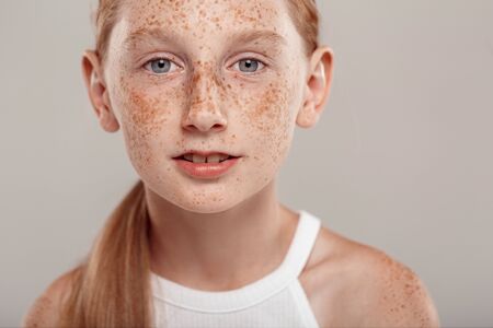 Inclusive Beauty. Girl with freckles and ponytail standing isolated on grey smilign excited close-up