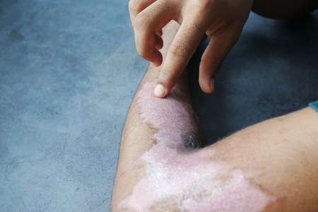 Closeup of sunburnt skin with peeling signs of sun damage and overexposure Concept of skin health care and wellness self care routines and the effects of too much sun exposure on the epidermis