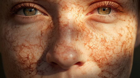 Extreme close-up of freckled woman staring intensely at camera. AI-generated.