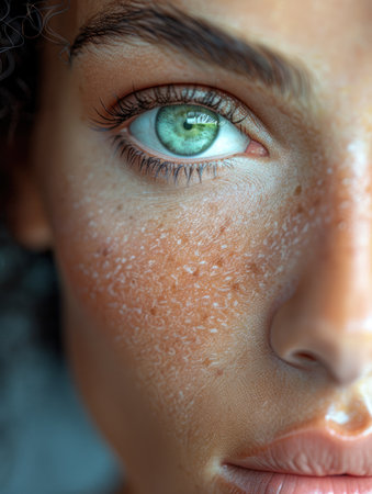 Woman face with natural freckles and green eyes, illuminated by soft sunlight, highlighting skin texture and unique features.