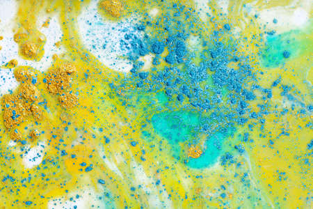 Mixed paints art. Abstract design background. Blue gold black glitter ink blend