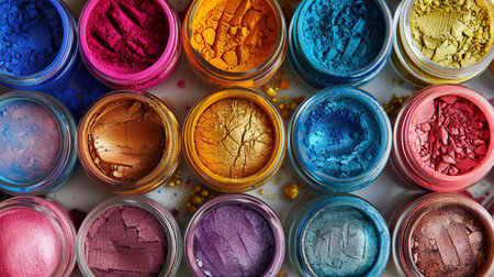 A vibrant arrangement of colorful powder pigments displayed on a beautifully designed artistic background. Perfect for creative projects and artistic expression.