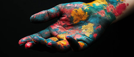 A person with their hands painted in different colors. Concept of creativity and playfulness, as the person's hands are covered in paint, suggesting that they have been engaged in an artistic activity