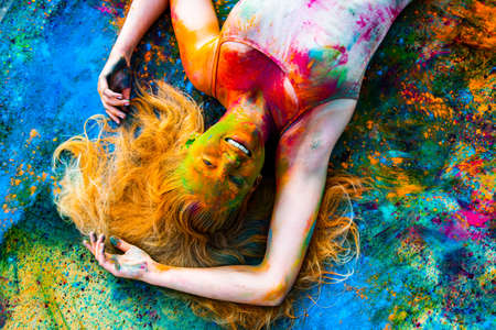 Young woman covered with a colourful paint