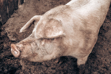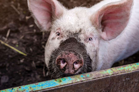 Dirty pig with muddy snout in organic farm pigsty, close-up on pig's nose.