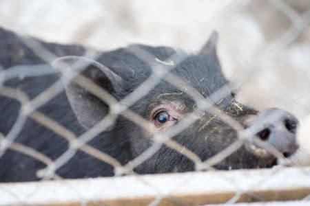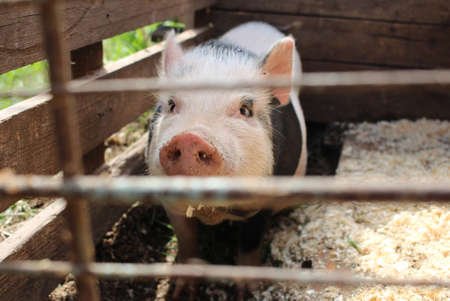 A little pig shows his round pink nose a little piglet with two holes sticking it out of the cage stall
