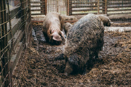 Wild boars family walking on the straw in a pigsty of zoo. farm life. Animals in enclosure. Dirty. Large dangerous pets. hairy pig. Wet weather. Strong aviary fence. no people. Rural tourism.