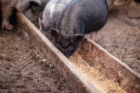 Agriculture - pigs pigs farming at livestock farm. Agricultural Farm with Pigs eating oat. Pork Production - Feeding. Pigs Breeding.