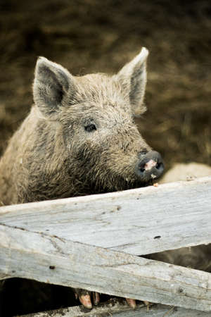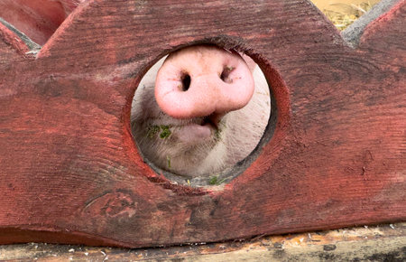 A piglet with a pink nose, a piglet peeps out of a house on a pig farm waiting for food for the holiday