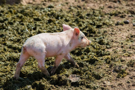Piglets on a farm in the sun. The concept of farming and agriculture.