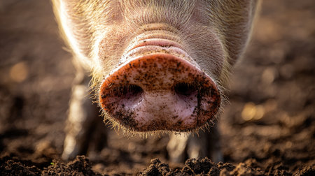 A close-up of a pig's snout as it roots in the dirt, capturing the fine details of its whiskers and textured skin. The earthy background adds to the rustic feel, with no humans in sight