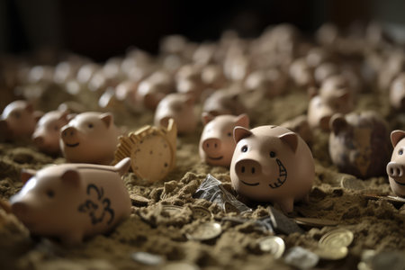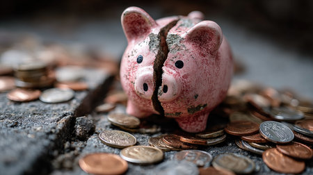 A broken piggy bank surrounded by scattered coins represents financial struggles and the challenges of saving. It reflects economic uncertainty and budgeting issues.