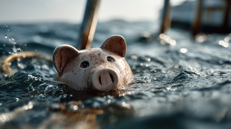 This image captures a pig-shaped float toy partially submerged in water, evoking a sense of playful summer activities, joy, and carefree adventures.
