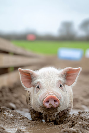 A piglet rolling in a patch of soft mud, with a look of pure joy on its face, framed by the rustic wooden fences of the farm.