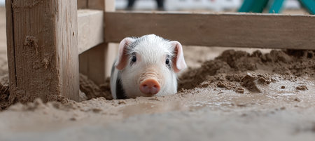 Adorable Miniature Piglet Joyfully Playing in Mud at a Rustic Farm Surrounded by Wooden Fencing
