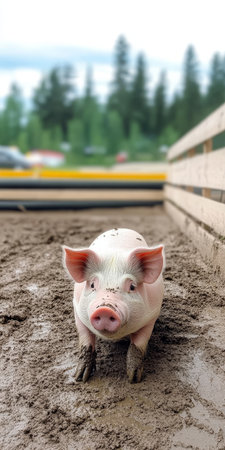 Adorable pink piglet playing in muddy area on a sunny farm, exploring its surroundings.
