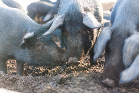 A small piglet digs through the rich, dark soil on a farm, its curious eyes and ears perked up as it enjoys the earthy aroma and texture of its surroundings.