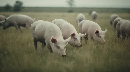 A herd of happy, free-range pigs forages peacefully across a vibrant green hillside under a bright, sunny sky. This idyllic pastoral scene captures the essence of sustainable, organic farming and the tranquility of rural life.