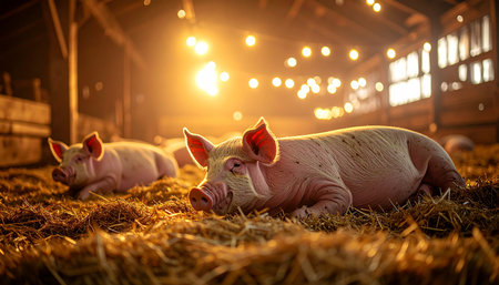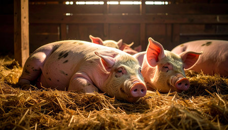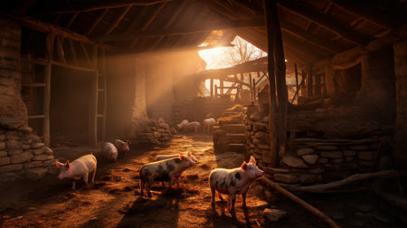 A group of contented pigs rests peacefully on a thick bed of straw inside a rustic barn. Warm, golden sunlight streams through the wooden slats, illuminating the scene and creating a tranquil, cozy atmosphere. This image captures a serene moment of animal husbandry and the simple, authentic beauty of farm life.