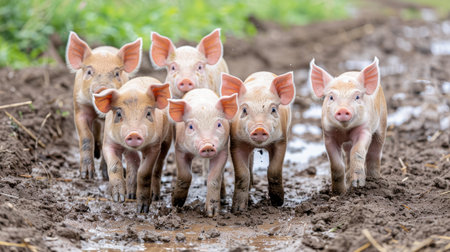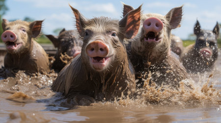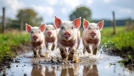 A group of four happy and energetic young piglets joyfully run and splash through a muddy puddle on a sunny day at the farm. This image captures a moment of pure, carefree fun and the simple pleasures of rural life, symbolizing freedom, youth, and friendship.