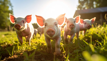 A curious group of adorable piglets runs forward through a lush green pasture, their ears glowing in the warm, golden light of the rising sun. This heartwarming scene captures the joy, innocence, and boundless energy of new life on a peaceful farm.