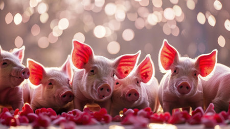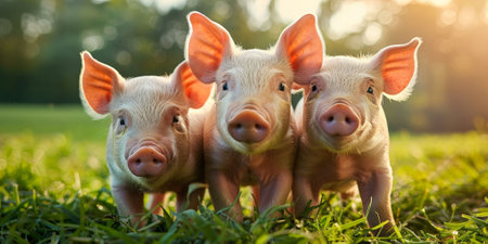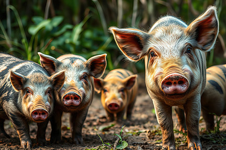 Adorable piglets stands together, their curious faces expressing playful energy under the warm sunlight. Playful nature in a sunny farmyard setting. Cute piglets gathered together. Generative AI.