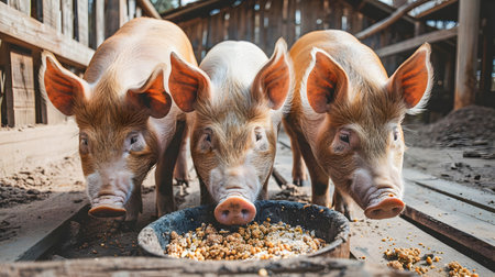 Close-up shot showing the daily routine of feeding pigs in a cozy pigsty adorned with hay beds. Generative AI