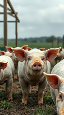 Piglet standing in a muddy farm pen on a cloudy day, looking directly at the camera with other pigs blurred in the background, representing livestock farming and animal welfare