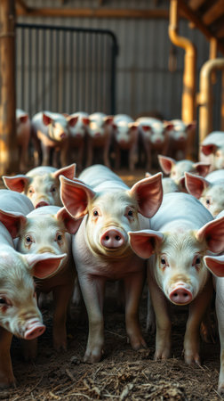 Pigs waiting feed,pig indoor on a farm yard. swine in the stall --ar 16:9 --v 6 Job ID: f3d6f071-74bc-4c67-b4ab-0e44ab38f85a