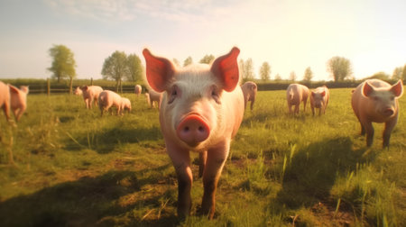 A young pig stands in a lush green pasture, its ears glowing in the warm, golden light of the setting sun. In the background, other pigs graze peacefully, creating an idyllic scene of free-range farming and tranquil country life.