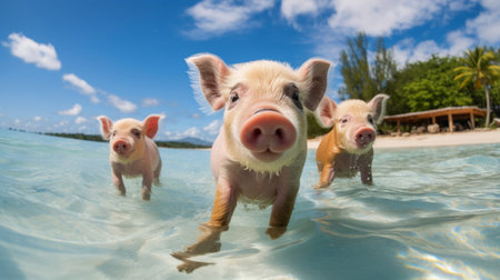 Pigs swimming in ocean. Travel and tourist attraction. Good life concept