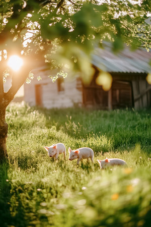 Joyful piglets frolic across lush green grass, their pink skin shimmering brilliantly under the warm sunlight beside a rustic farmstead. Nature flourishes around them.