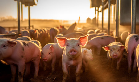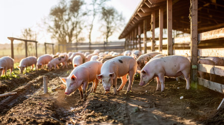 Morning sunlight casting a warm glow on a well-maintained pigsty, where pigs roam freely in a spacious enclosure. Generative AI