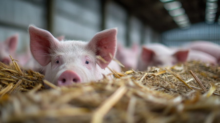 A playful piglet peeks out from a bed of straw in a cozy agricultural barn. The soft natural lighting highlights the innocent curiosity of this charming farm animal, creating an endearing scene.