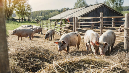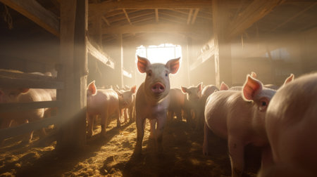 A group of contented pigs rests peacefully on a thick bed of straw inside a rustic barn. Warm, golden sunlight streams through the wooden slats, illuminating the scene and creating a tranquil, cozy atmosphere. This image captures a serene moment of animal husbandry and the simple, authentic beauty of farm life.