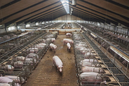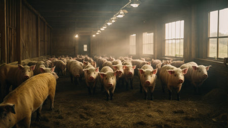 Pig barn interior, many pigs, soft morning light through windows, wide shot