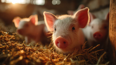 This charming image captures adorable piglets resting in straw inside a rustic barn. The warm golden hour light enhances their playful expressions and peaceful ambiance.