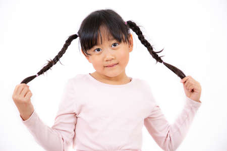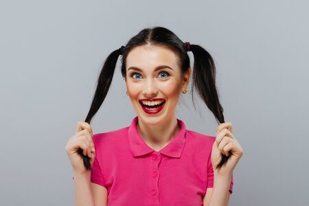 Closeup portrait of cute smiling happy student or teen girl looking at camera on white background. Young woman with short pigtails and wears white t-shirt. Positive human emotions, facial expression