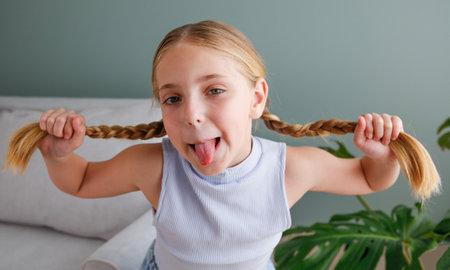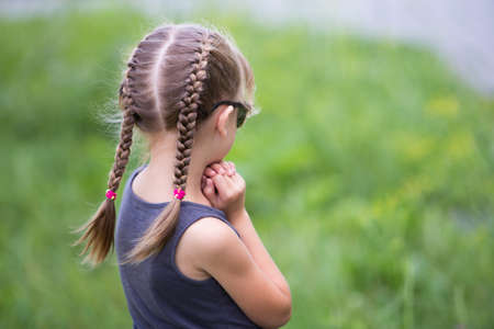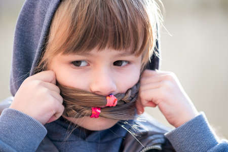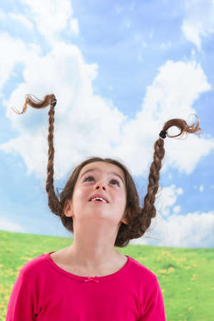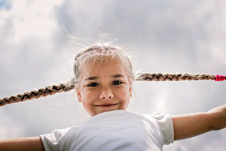 Close-up candid portrait of cute 7-8 years old girl with two funny braids taken up at the sky from the ground, happy summertime, outdoor lifestyle