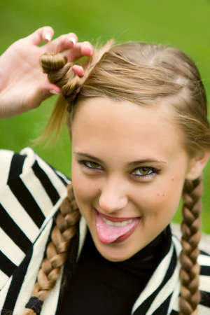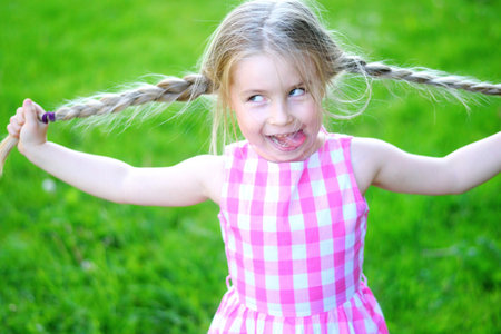 lovely child girl wearing white shirt having fun holding her pigtails and showing her tongue in a sunny summer park. pine trees on a background
