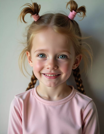 A cheerful Swedish girl with two playful ponytails, wearing a pink shirt, beams joyfully with a natural, glowing smile while standing against a soft backdrop.