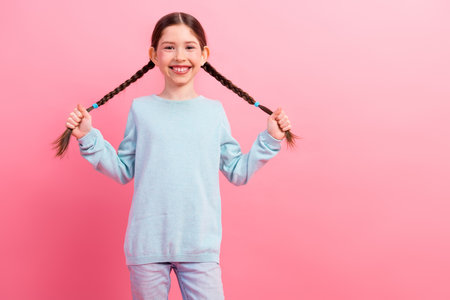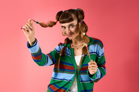 Cheerful young girl holding her braided hair with a playful smile against a bright pink background in casual attire