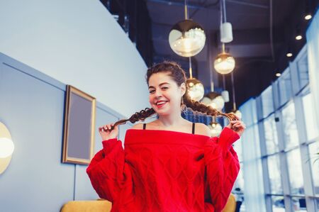 portrait of a positive smiling girl with pigtails and a red sweater in the room