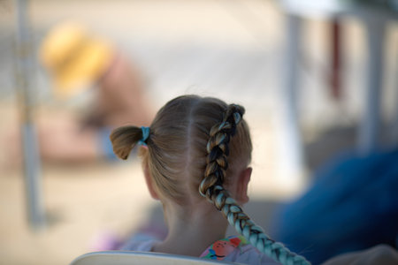 Portrait of pretty child girl with braids in hair outdoors in summer.