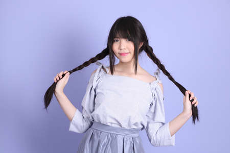The young Asian girl in purple preppy dressed standing on the purple background.
