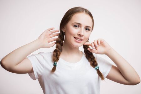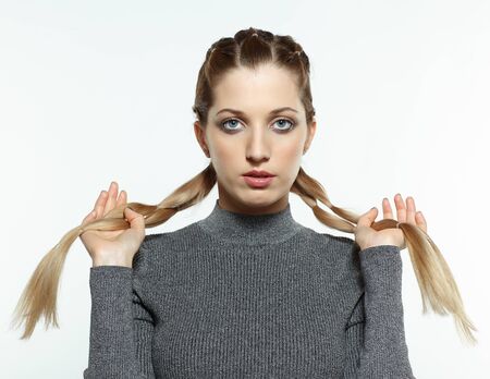Portrait of beautiful young dark blonde woman. Female with creative braid hairdo on gray background. Girl holds braids in hands