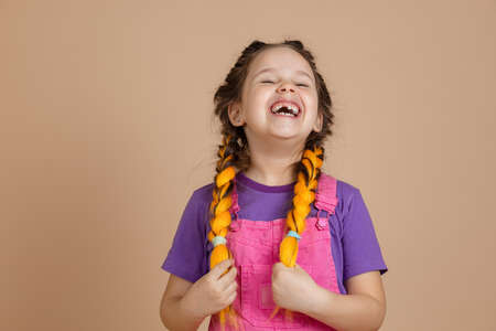 Portrait of young girl with kanekalon braids of yellow laughing out loud with opened mouth, with missing tooth touching hair with hand wearing pink jumpsuit and purple t-shirt on beige background