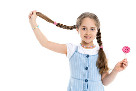 smiling girl with lollipop holding braid and looking at camera isolated on white