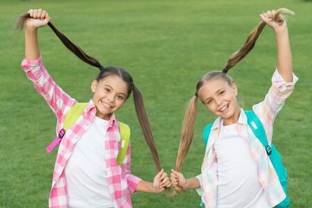 For style and care you deserve. Happy children hold long hair tails. Hair care. Haircare. Children care. Childcare and pediatric health care. Beauty salon. Look your best