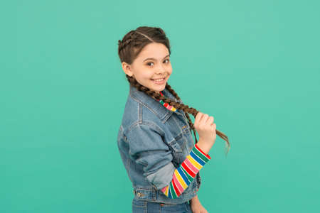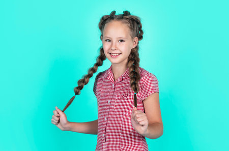 happy girl has beautiful hairstyle. kid with braided hair. child with nice smile. female hairdresser salon. beauty and fashion. childhood happiness. looking stylish and trendy